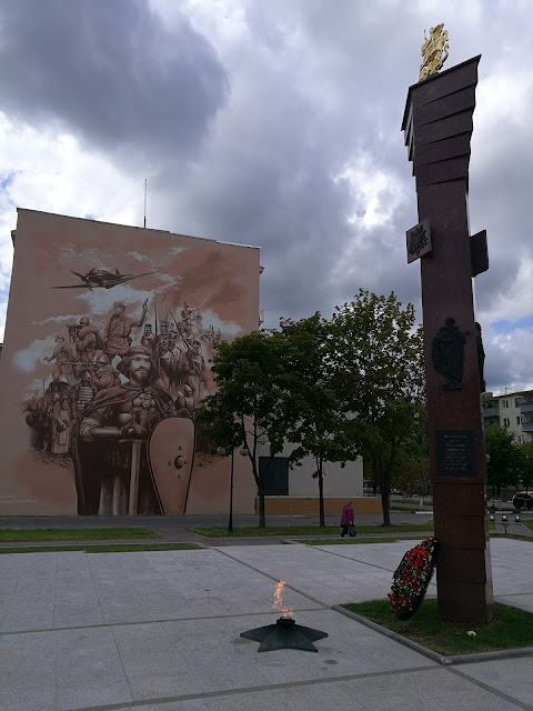 А с другой стороны кинотеатра – площадь Славы с вечным огнём, стендами героев, почётых граждан и еще одним муралом (на задней стороне кинотеатра).